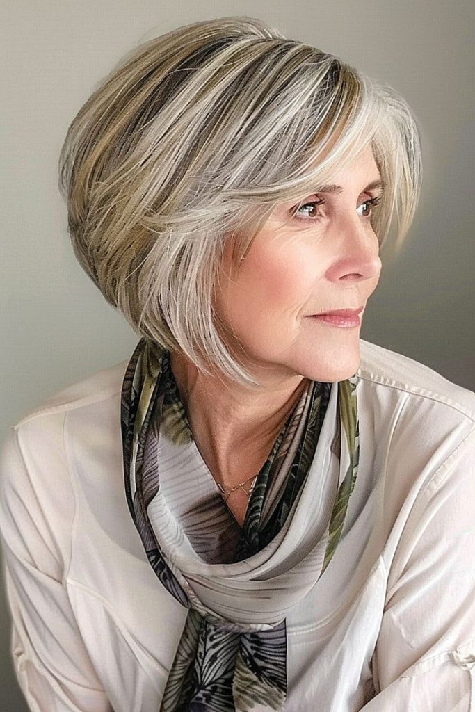 This elegant layered bob with subtle highlights is perfect for women over 60 who want a refined and polished appearance. The layers add depth and texture, while the highlights provide a touch of brightness, enhancing the overall mood of the haircut. Ideal for fine hair, this style creates the illusion of fullness and volume.