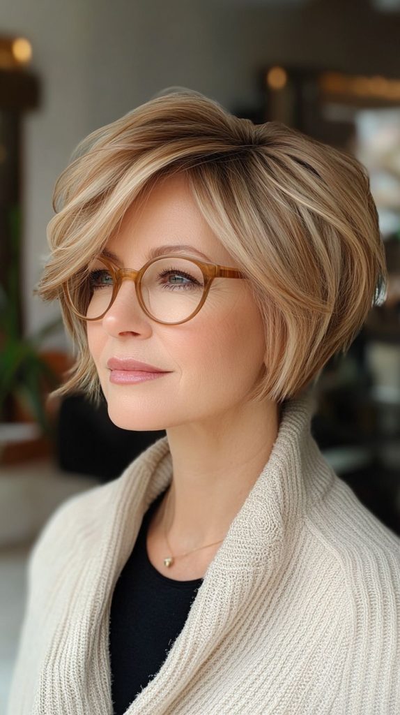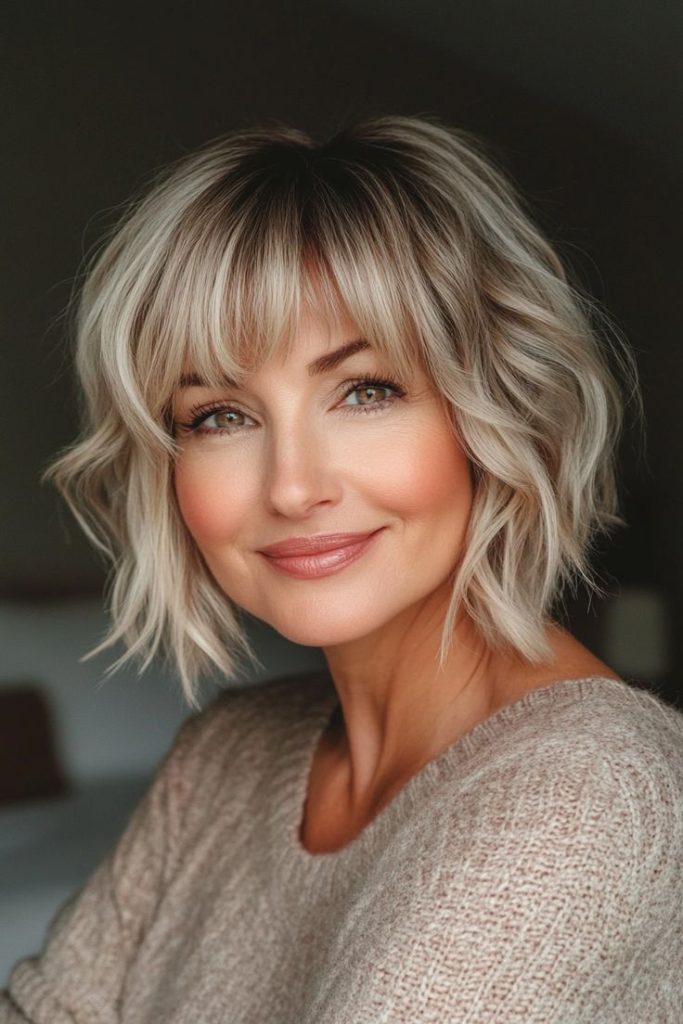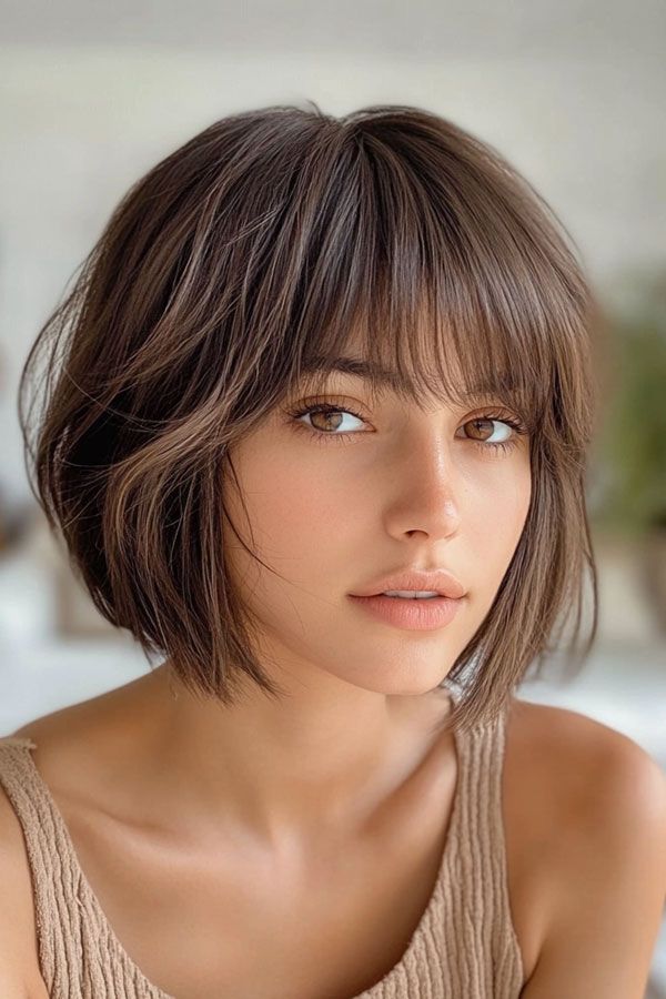 A choppy bob with subtle highlights offers texture and dimension, making it a fun and versatile choice. The choppy bangs enhance the playful feel, while the highlights add a touch of brightness. This look is ideal for women seeking a cute and modern hairstyle that’s easy to style.