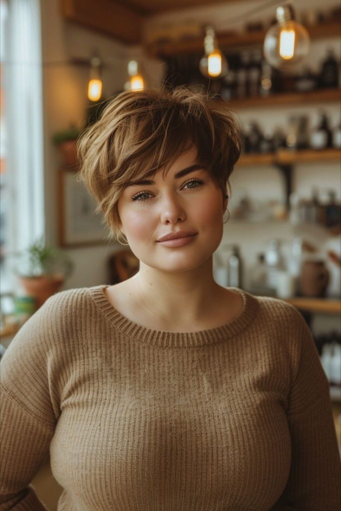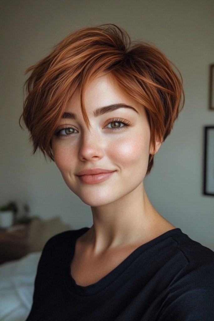 This auburn pixie with soft bangs combines warmth and elegance. The rich auburn hue enhances the overall style, while the soft bangs add a touch of femininity. This hairstyle is ideal for women with a round face, as it softens and balances the features.