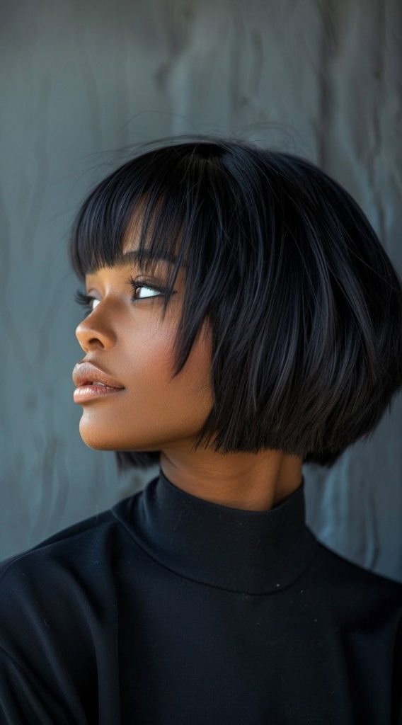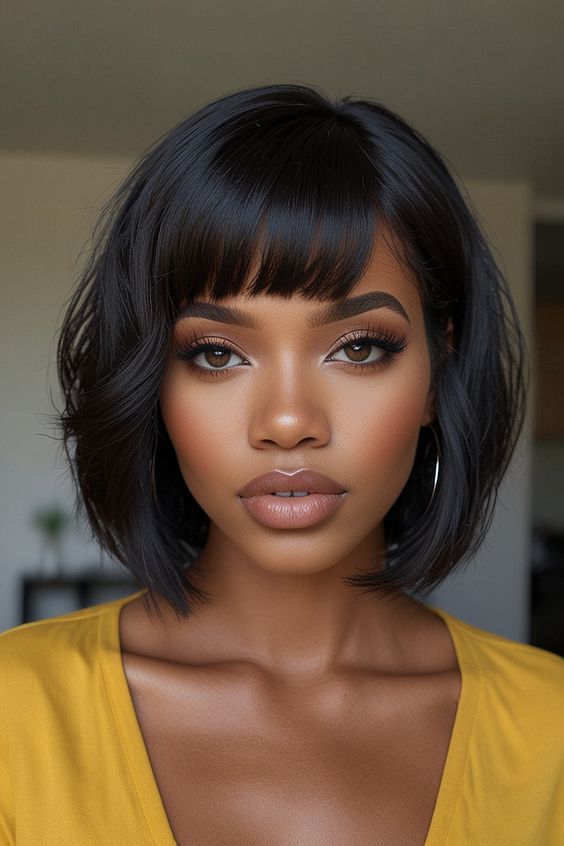 A sleek black bob with blunt bangs is a bold and confident choice. This straight, structured cut highlights the sharpness of the bangs and frames the face beautifully, especially for black women. The deep black tone adds a sophisticated and modern touch, making it perfect for both casual and formal settings.