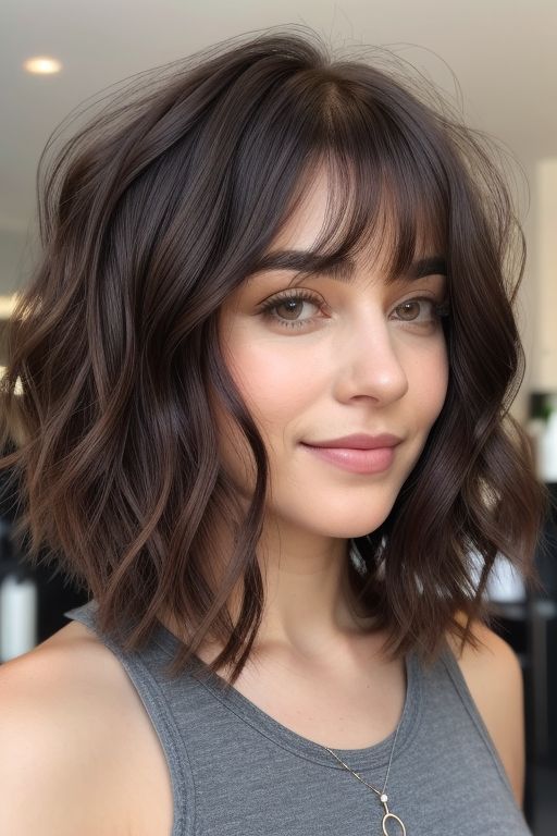 Wavy Brunette Bob with Curtain Bangs