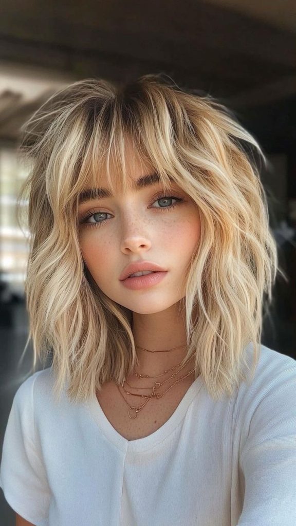 The textured blonde lob with choppy bangs is a bold and edgy choice. The uneven bangs and layered lob create a dynamic, youthful vibe that suits various face shapes. The light blonde hue brightens the overall look, making it an excellent option for those seeking a fresh and vibrant style.