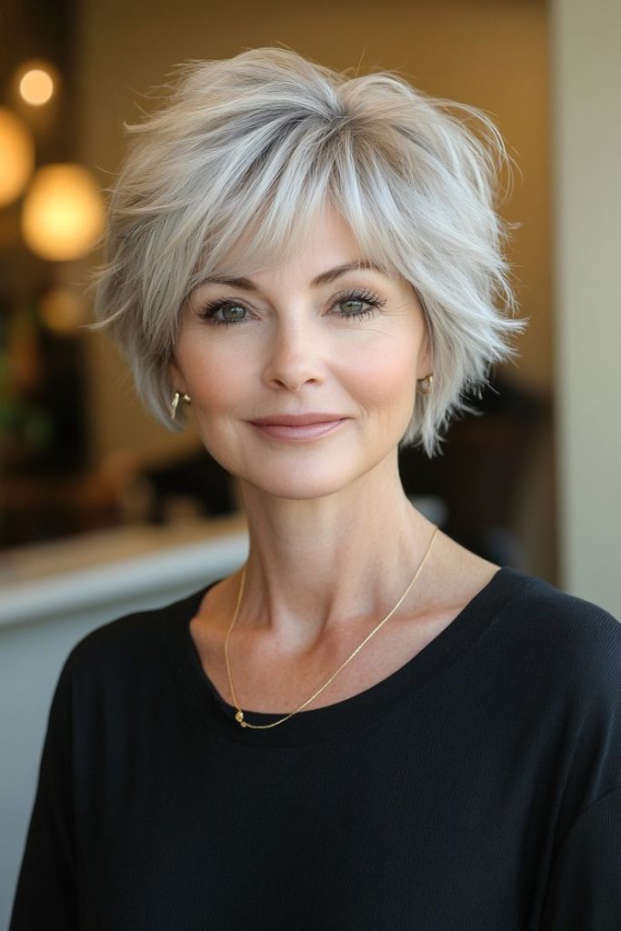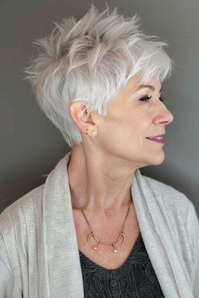 This silver pixie cut with spiky texture brings a bold and confident vibe. The icy silver tone complements the short, spiky layers, creating a modern and futuristic aesthetic. Ideal for older women looking for a fresh, youthful look, this pixie cut exudes elegance and edge.