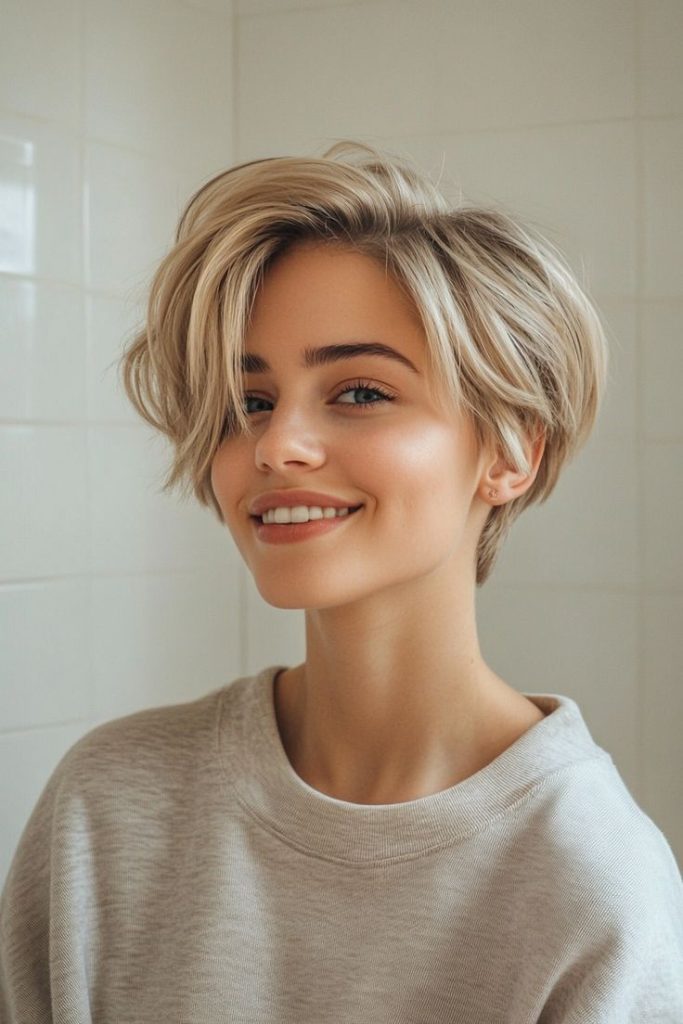 The frosted platinum pixie with side bangs offers a bold and contemporary look. This striking hair color complements the short, layered cut, while the side bangs soften the overall style. It’s a stunning option for women with round face shapes, as the side-swept bangs create a slimming effect.