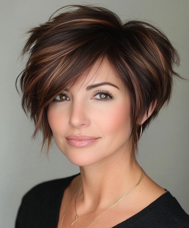 A sleek dark pixie with side-swept layers is a sophisticated and versatile choice. The deep hue and smooth layers offer a refined appearance, while the side-swept bangs add softness and balance. This hairstyle is particularly flattering for women with angular face shapes as it smooths out sharp lines.