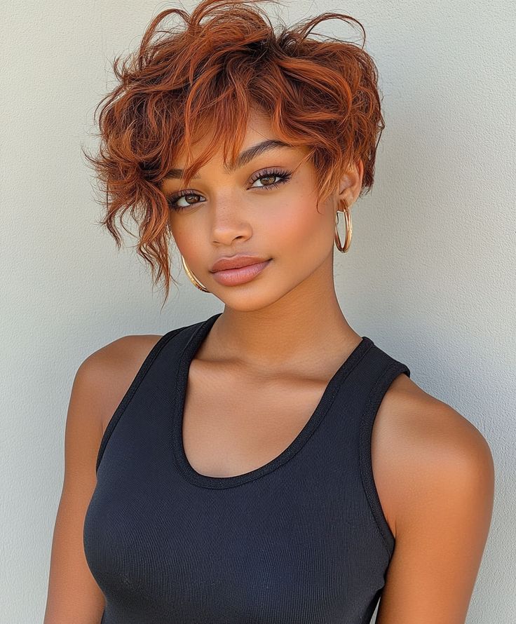 This vibrant curly copper pixie is an excellent choice for black women or anyone with naturally curly hair. The short length accentuates the curls’ bounce, while the copper tone adds warmth and vibrancy. The layered curls give the hairstyle a voluminous and lively look, perfect for those who love to stand out.