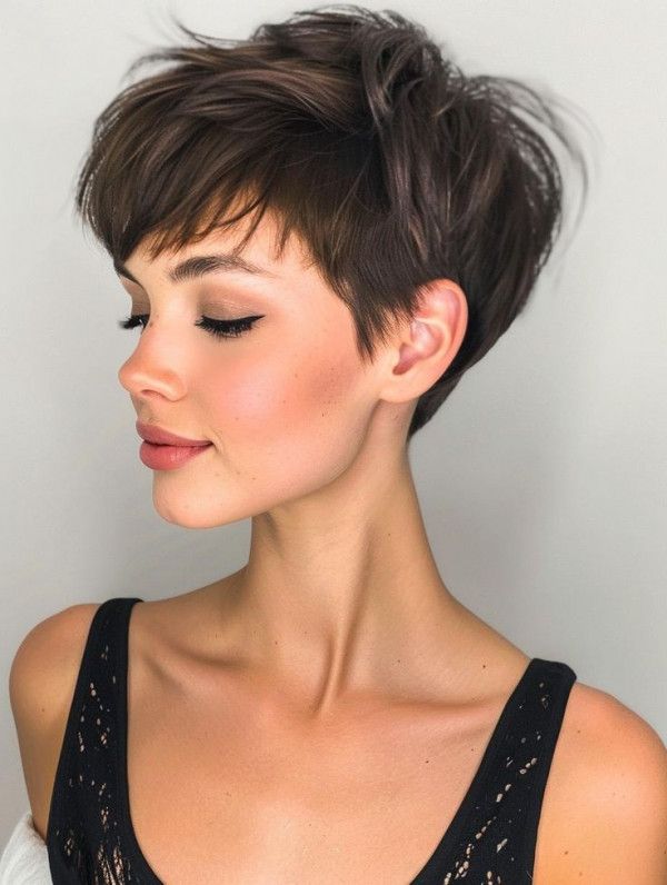 A textured chestnut pixie with choppy bangs provides an effortless yet stylish vibe. The choppy layers create movement, while the warm chestnut color adds depth. This hairstyle is perfect for those who want a low-maintenance yet cute hairstyle that looks polished.