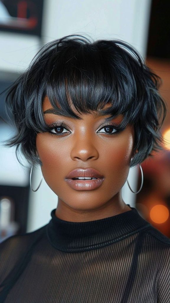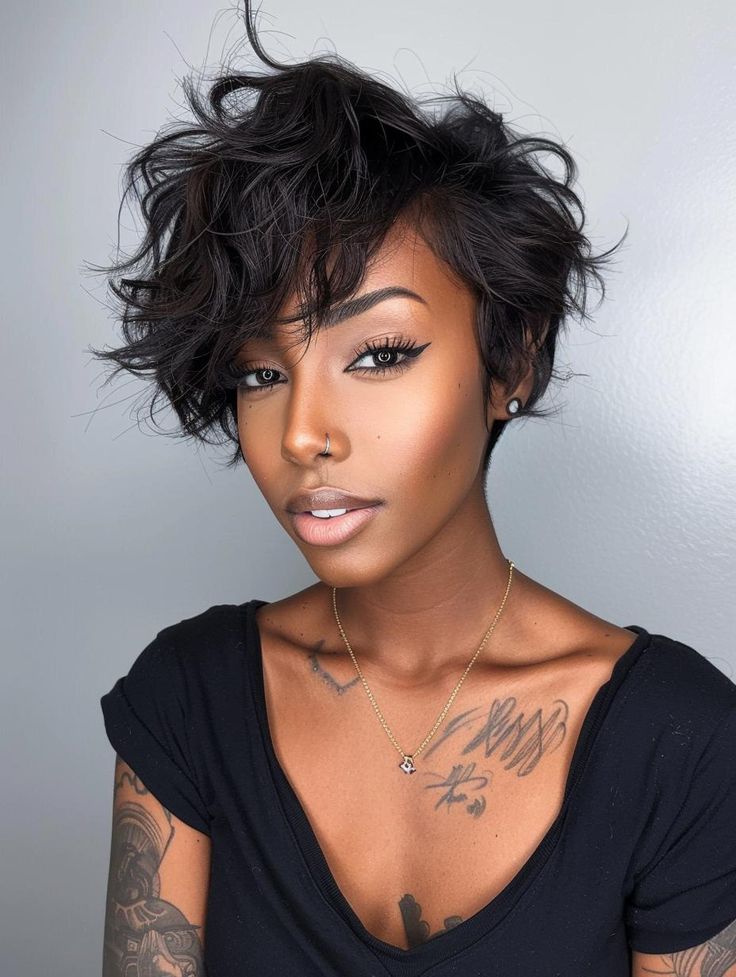 This short pixie combines texture and volume for a dynamic, edgy look. The choppy layers add depth, while the side-swept crown brings a soft yet dramatic flair. This style is perfect for black women or anyone seeking a haircut that exudes power and grace.