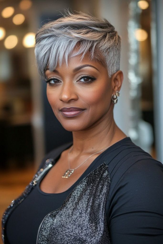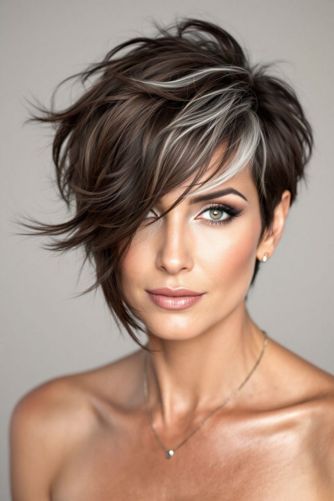 This pixie cut with shaggy layers and silver highlights is a versatile and contemporary option for cuts for women over 50. The textured layers bring a youthful charm, while the silver strands add elegance.