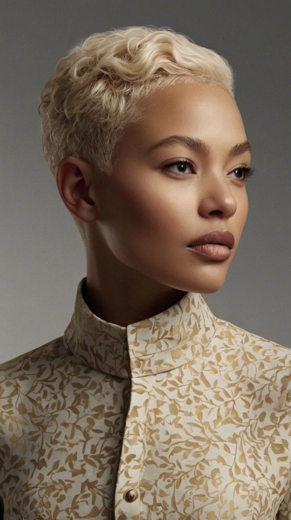 Elegance meets boldness with this softly waved pixie cut in platinum blonde. The short, textured waves provide subtle sophistication, making it ideal for older women hairstyles or younger trendsetters looking for timeless appeal.