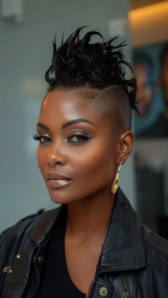 To style, use a strong-hold gel or pomade to sculpt the top into a mohawk shape while keeping the sides sleek. This haircut is ideal for showcasing statement earrings or bold makeup, making it a go-to for special occasions.
