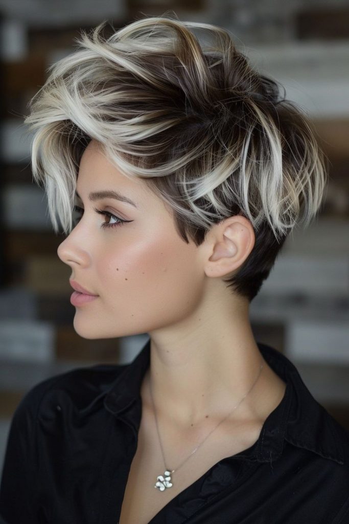 This tousled pixie cut with blonde highlights radiates sophistication and fun. The strategic layering adds height and texture, making it ideal for older women or anyone seeking a youthful, lively appearance. The feathered edges create a light, airy feel that works exceptionally well for round faces by elongating and balancing proportions.
