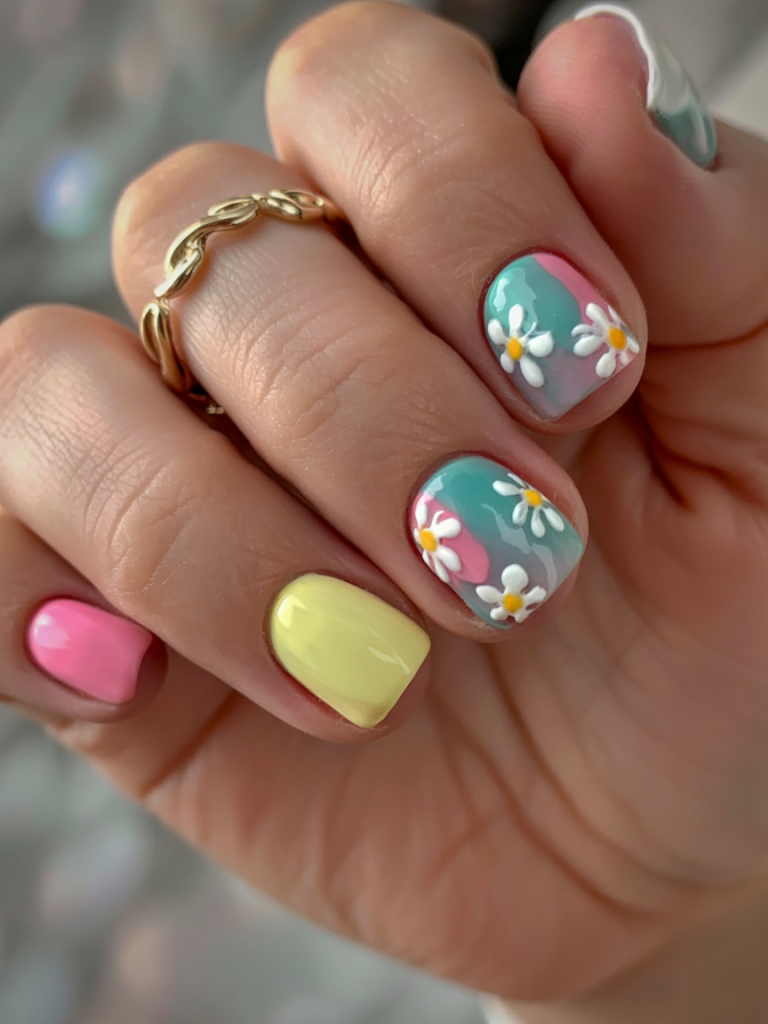 This mix of pink, yellow, teal along with daisy designs creates a mani that stands out as ultra-cute and bright with multiple colorful elements. The visual effect of this manicure comes from alternating colors that represent specific moods, which slowly soften as delicate 3D daisies are arranged on the pink and teal background. The barefoot appeal of this nail art lends itself to social events with its quirky aesthetic yet trendy vibe that matches summer 2025 fashion trends. The natural nail shape takes on a soft squoval formation that keeps the presentation both neat and pleasing.