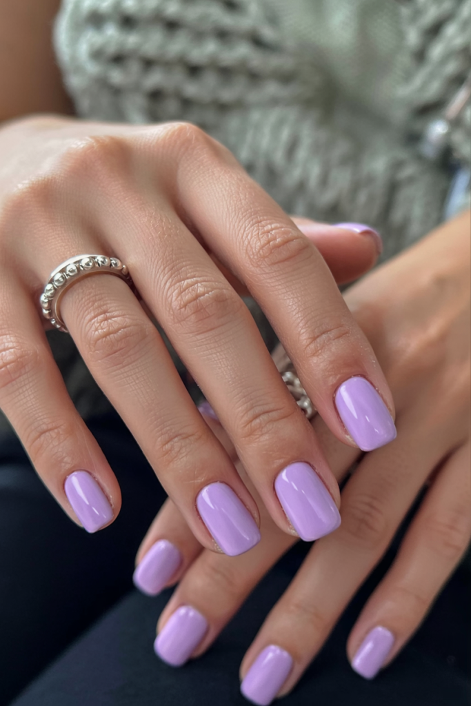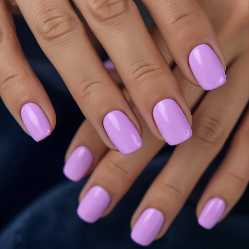 Sometimes less is more. This ultra-shiny lilac hue on square-shaped natural nails offers timeless elegance. This manicure offers polished charm while maintaining an understated appeal and is one of the most elegant choices in the 2025 Simple Designs category.