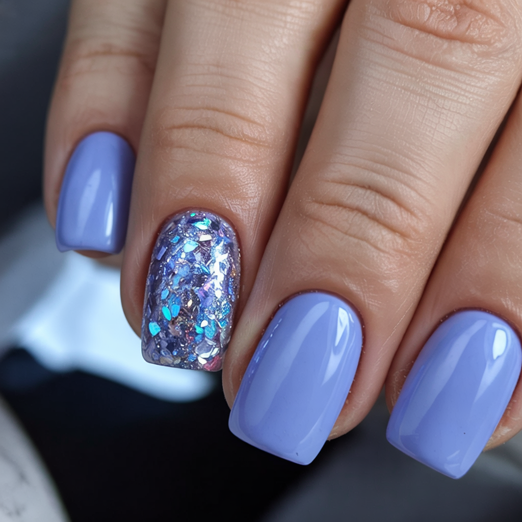 People who want a stylish look with the convenience of short nails should consider this lavender glitter look. A lavender set includes a striking accent detail turned into chunky glitter that shows reflections of blue silvers along with lilacs. This style successfully blends 2025’s chrome tendencies with 2025’s simple simplicity for a perfect look. The square shape presents an everyday wearability that suits any glamorous occasion.