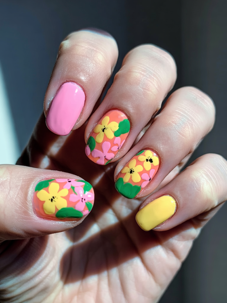 The floral pattern is inspired by garden blooms and outdoor brunch settings, combining soft pinks with yellows and greens to create an enchanting garden ideal. The set applies vibrant color to natural nails, which are given a rounded squoval shape to deliver nail art joy in a purposeful way. The design is a must-have for women who want to incorporate feminine playfulness into their 2025 fashion routine.