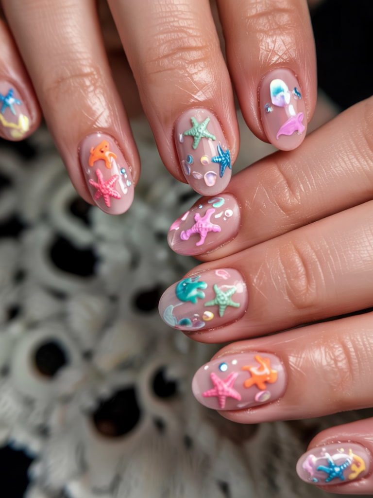 The nail art community in 2025 features three-dimensional accessories, which makes this underwater design one of the many reasons why they dominate the industry. The nude background supports playful marine images such as starfish and dolphins, joined by bubble elements to create a fantasy effect. The oval nail shape with gel or acrylic finishes gives this nail design both movement and a delicate look.