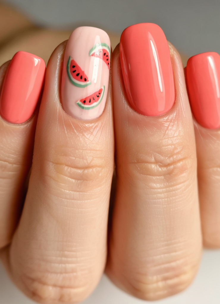 The manicure features coral color with adorable watermelon images on a blush background as its summery fruit dedication. The nail art design brings a fun, bright playfulness to your fingertips with a colorful design that remains attractive within a warm color scheme. The square nail design with gel-like shine creates a contemporary elegance that matches your youthful look.