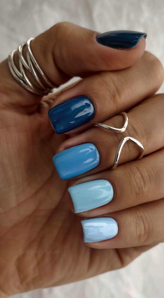 The blue ombré gradient nails are the perfect tribute to the predicted summer atmospheres of 2025. Fashionistas looking for moderate yet impactful shades will appreciate this blue transformation that moves from midnight navy to pale sky blue as it brings fresh and crisp details to their nails. The square nail shape maintains a modern look that complements denim, linen and swimwear outfits.