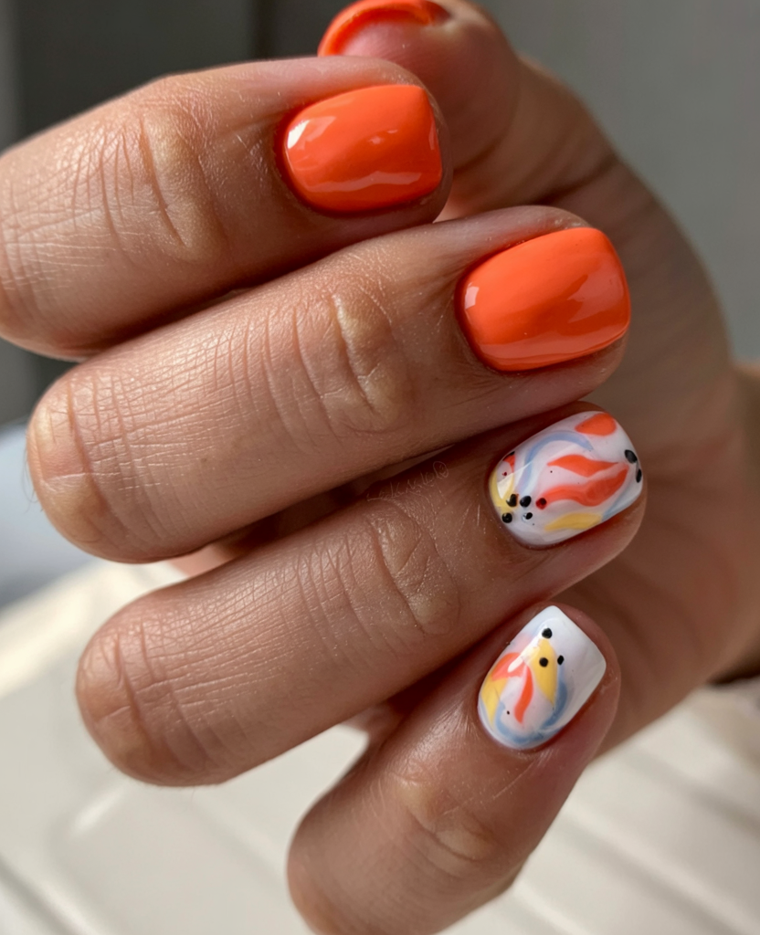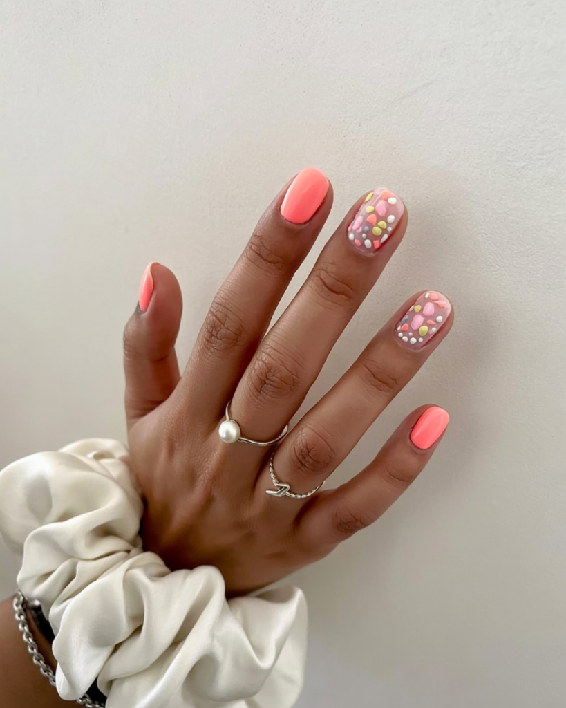 Vibrant coral neon takes the top spot, while dotted accent nails complete this design with soft pastels and bright yellow shades. The nail art technique offers a light and graceful decoration that works well for people who want to incorporate different textures without going overboard. These nails work best with short-length, natural-looking nails that are either round or oval in shape.