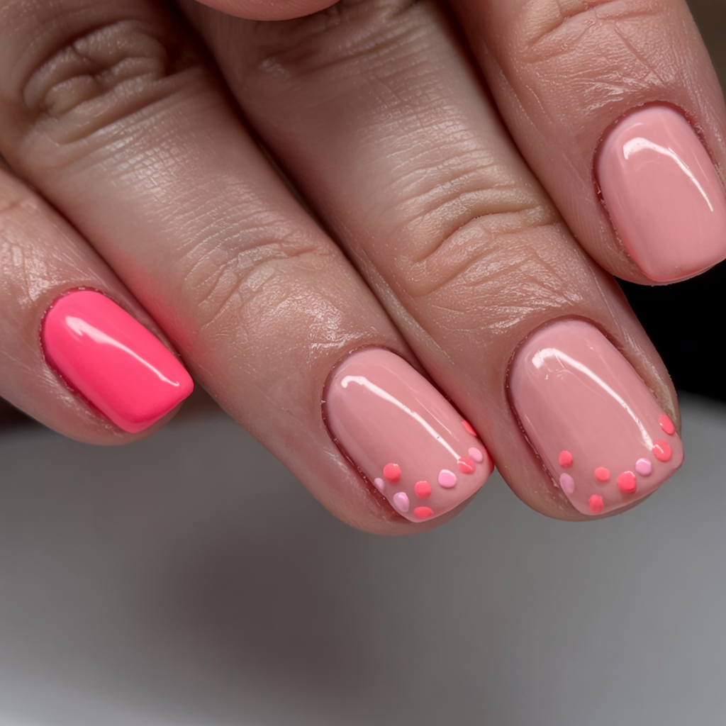 A dotted pattern applied to the nail tips transforms basic pink nail designs into a newfound elegance. People can approach this stylish French manicure variation to increase their nail art acceptance in the year 2025 without breaking the barrier of basic trends. Cold pink and soft pink create a delicate color contrast that works perfectly with the wearable squoval nail shape.
