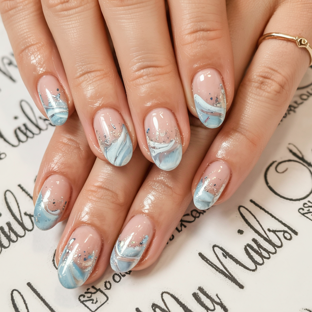 The design brings oceanic wave energy through its light blue, white and silver swirls against a glossy nude base. A touch of bling comes from the sparkling details that accompany the elegant oval nail shape. The gel nail technique creates a beach-ready design that brings calm through serenity with stylish elements. The design beautifully represents nautical elements in a manner suitable for elegant events.