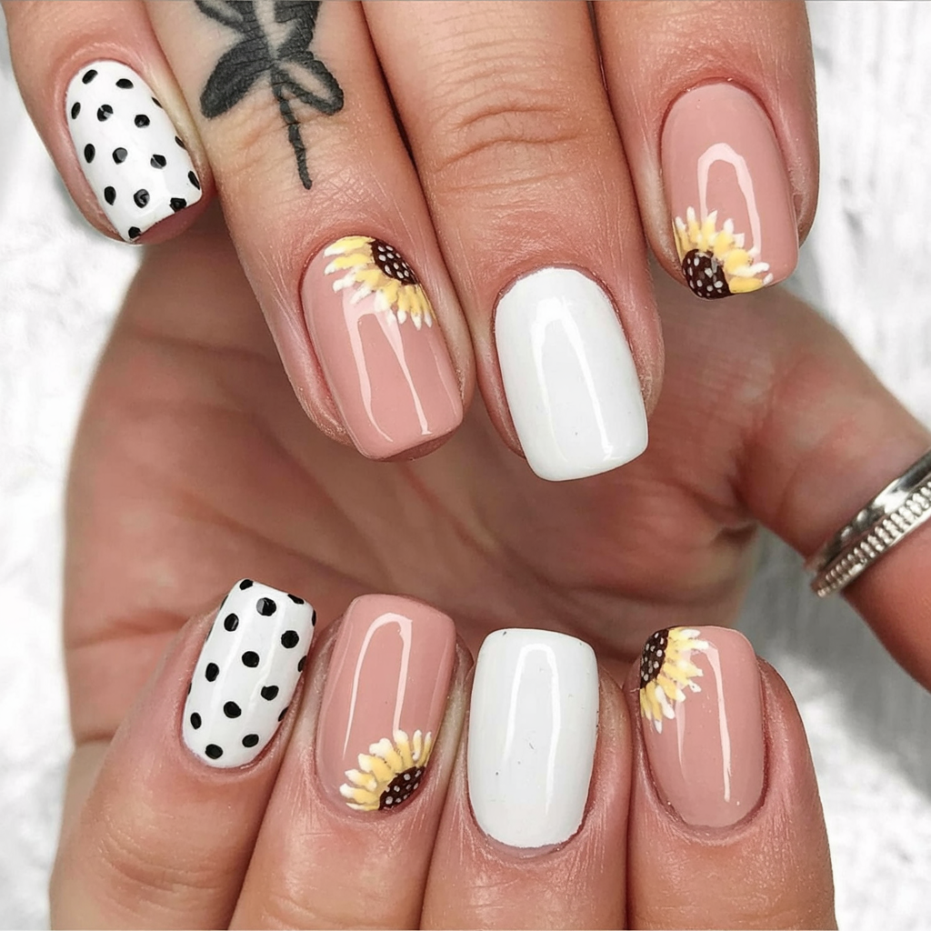 The eclectic nail set features an enthusiastic combination of black and white polka dots with sunflower brightness and neutral cream tones. The nail layout conveys an artistic super creative message that perfectly matches the 2025 fashion style through the use of square-shaped gel nails that provide structure between the different design elements.