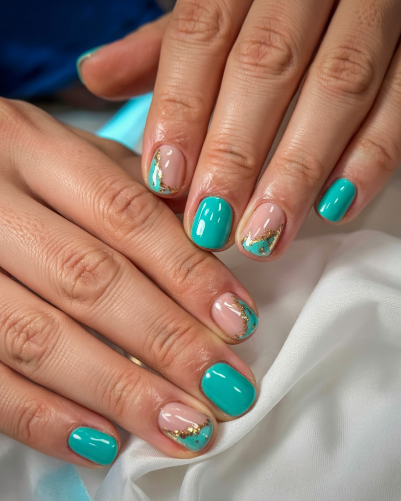 The manicure uses natural nail color and vibrant teal to create an elegant look with gold foil patterns. The solid and blank spaces create outstanding versatility that works both professionally and casually. Clean-cut, fashion-forward minimalists will appreciate the square shape, which beautifully blends functionality and style with its classy bling details.
