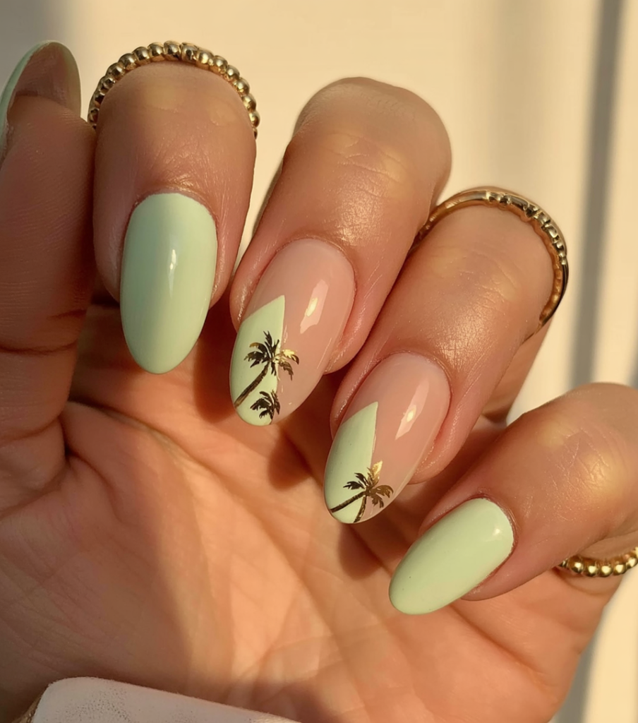 Drift off to an island paradise with mint green and nude colors that present sleek palm sketches for an island relaxation experience. This simple yet elegant layout offers understated beach elements in a sleek format. In 2025, people will love the almond nail shape, which shows elegance through its perfect presentation for a relaxed, luxurious look.
