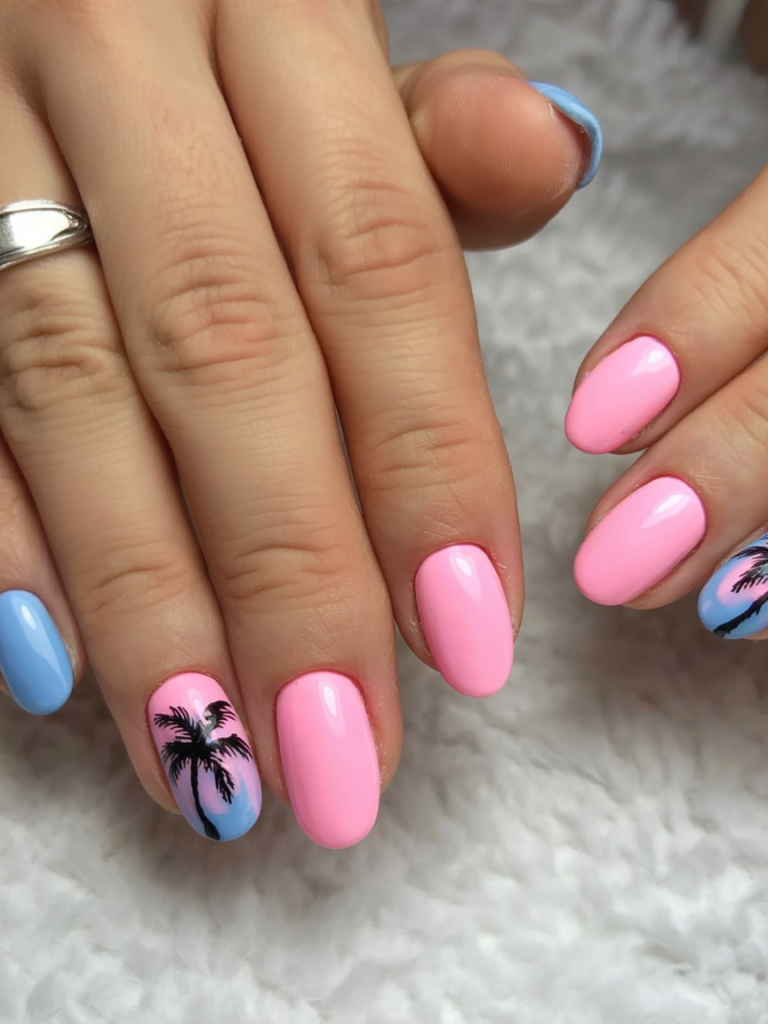 Palm-like black contours meet sophisticated pink and delicate blue nails to give your fingers the essence of a vacation. This classic oval design uses a tropical scene to bring an adventurous touch to summer fashion.