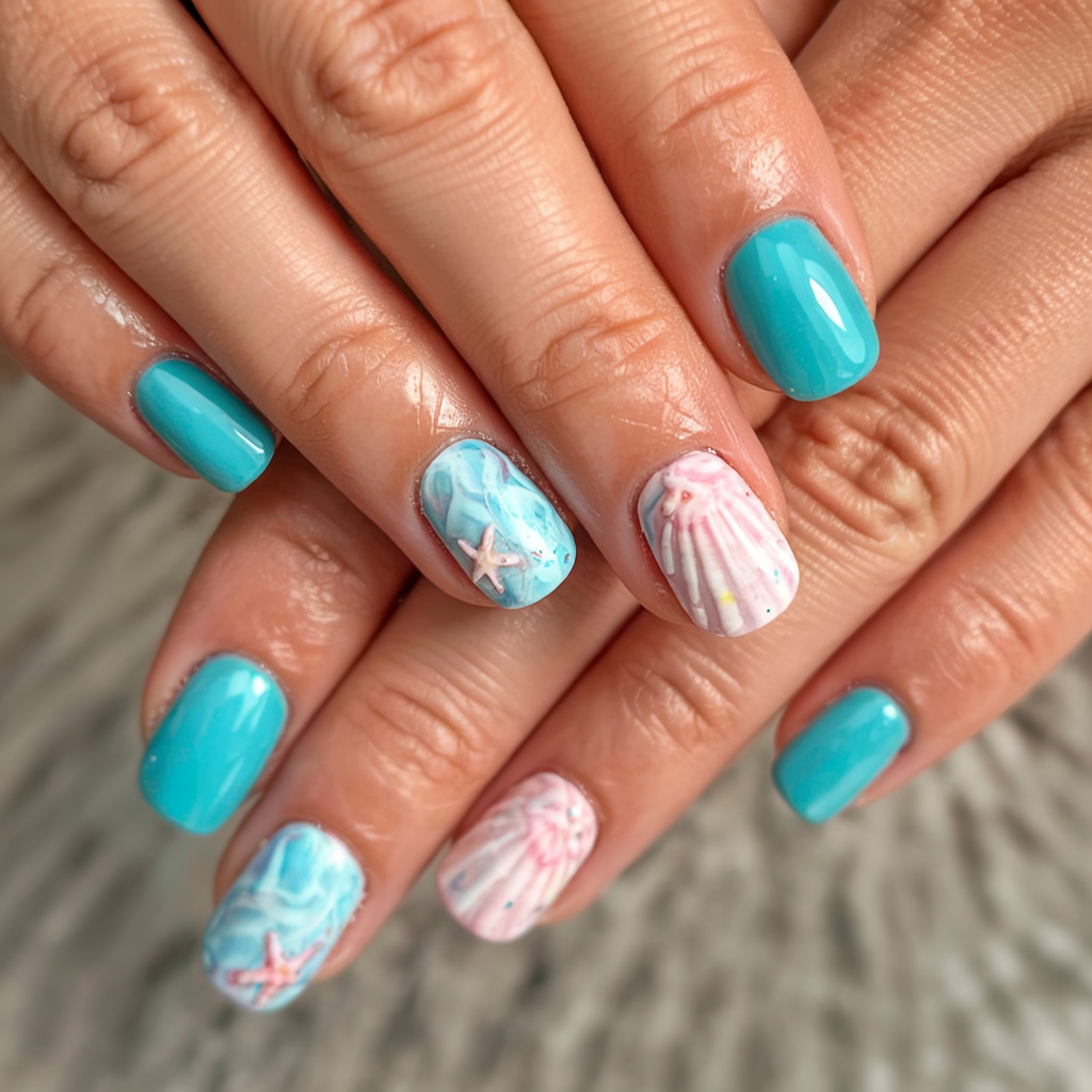 Late summer begins with the perfect combination of shells and starfish. The gel nail design presents ocean blues with delicately designed 3D elements that elevate your fingertips into an attractive wave pattern. Barbecues or beach and coastal ceremonies would both be ideal settings for this special nail design. A round nail shape brings softness to control the artistic detail of this design.