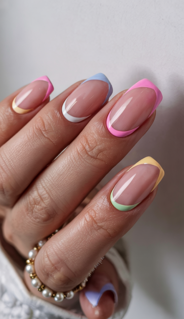 This 2025 simple manicure applies curved tips with pastel colors including pink, blue and yellow and mint to a natural nail base. Its elegant, fresh appeal makes it a great choice especially for people who enjoy soft-edge nail art. The squoval shape delivers the best of both worlds by being fashionable yet minimal maintenance.