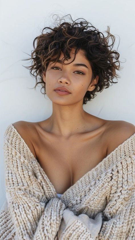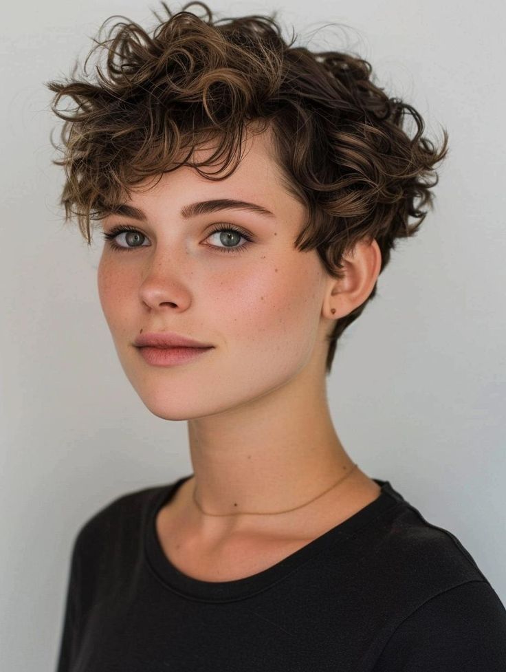 This curly pixie is both playful and polished, blending casual vibes with a refined edge. The natural curls are enhanced with strategic layering, giving the style lift and body. This cut is excellent for women with naturally curly or wavy hair who want a low-maintenance yet stylish look. The cropped sides and defined curls add structure, making this ideal for round or square face shapes.