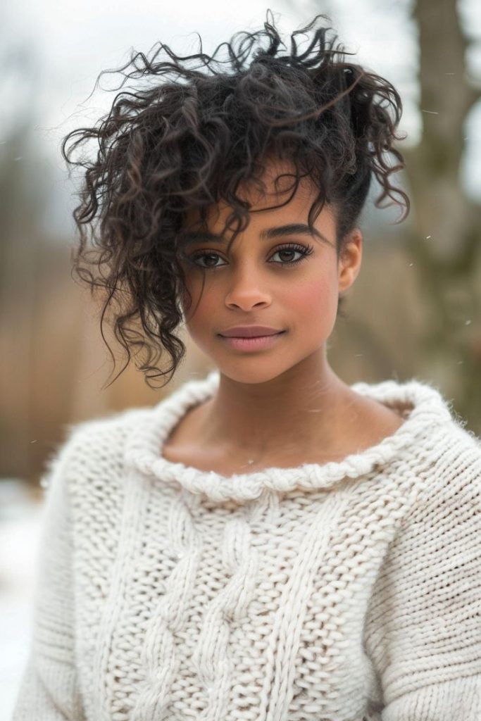 Define your curls with a curl-enhancing cream, and secure the updo with decorative pins. Pair with a cozy sweater for a laid-back, chic vibe.