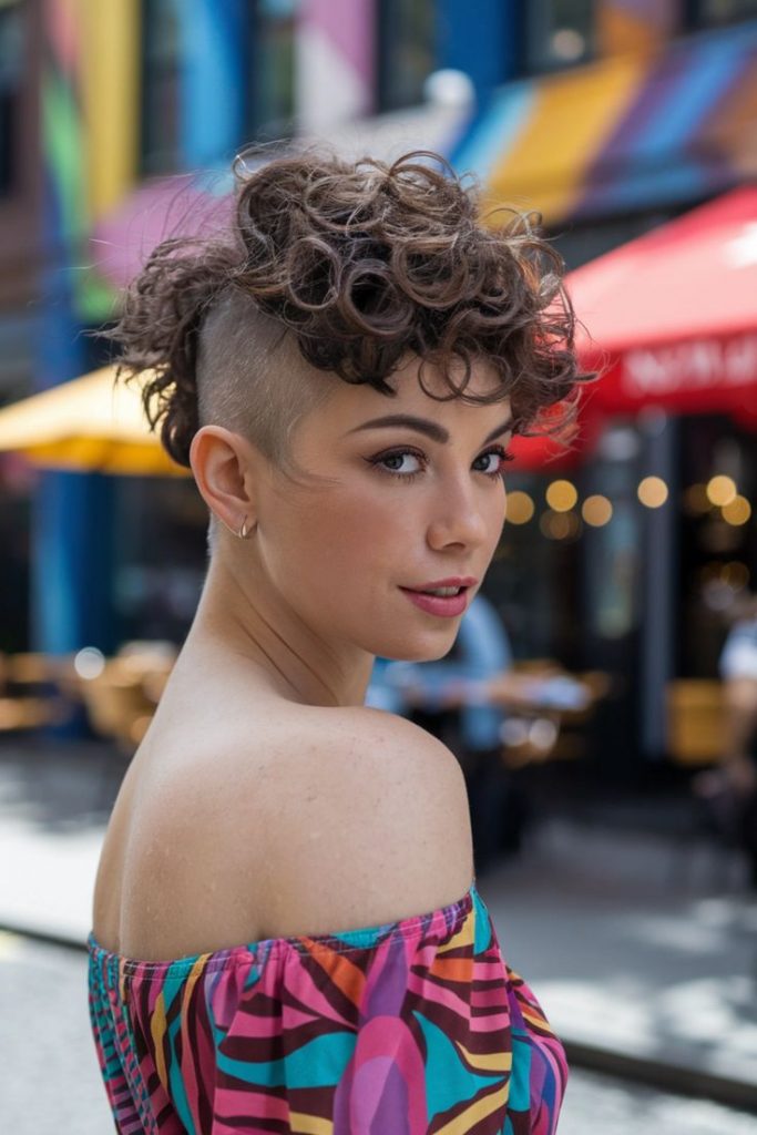 Define your curls using a curling wand and enhance the edgy vibe with a smoky eye. Regular maintenance of the shaved section is essential to keep the look sharp.