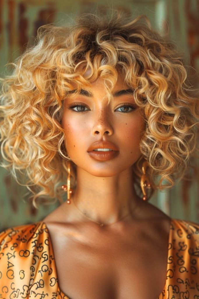 Golden curls with a soft fringe create a radiant, glamorous look. The warm hues and defined curls add vibrancy, while the fringe adds a youthful charm. This hairstyle with bangs is versatile, suited for casual settings and formal events alike.