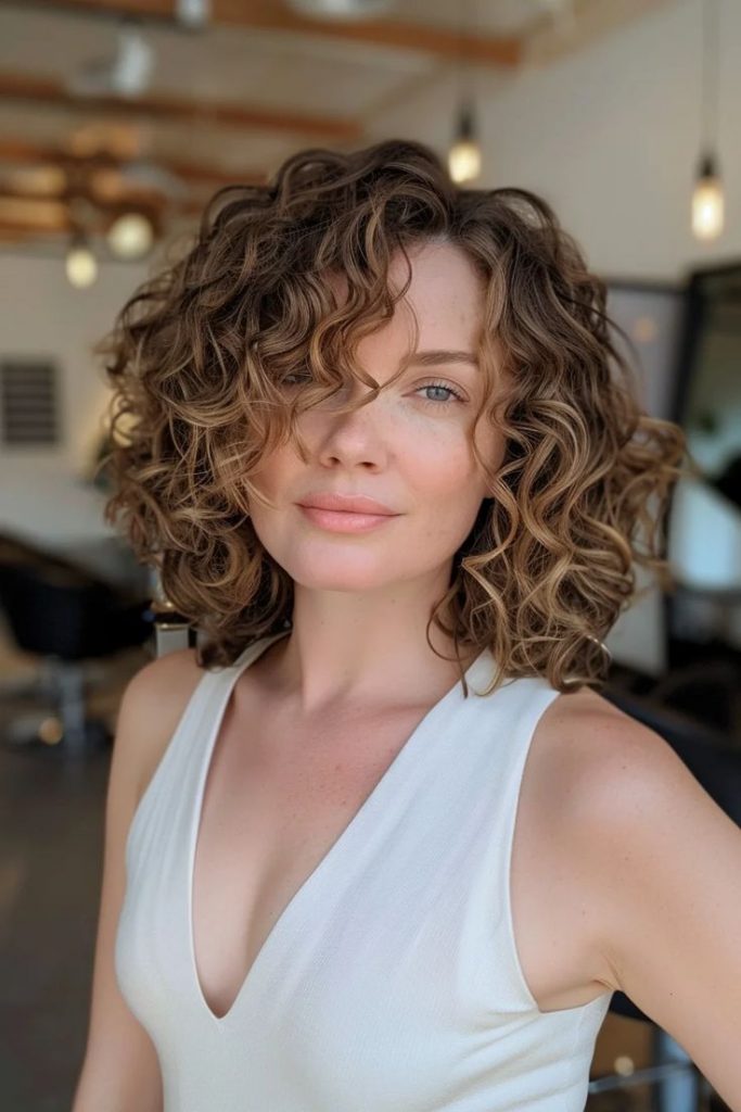This voluminous style features golden spiral curls and subtle layers that enhance the natural movement of the hair. The layers lighten the overall look, giving it a soft, romantic feel. This hairstyle is perfect for women with medium-thick hair who want a playful yet sophisticated cut.