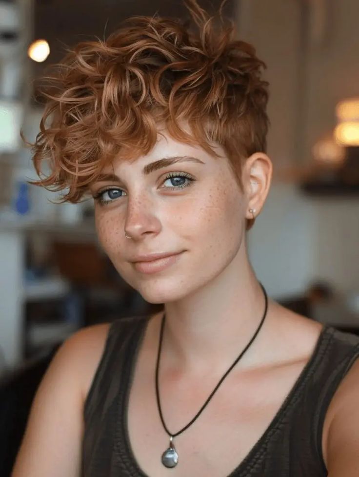 This Pixie cut is a delightful blend of softness and volume, ideal for those with naturally curly or wavy hair. The tousled curls create a natural aesthetic, framing the face beautifully and drawing attention to your cheekbones and jawline. This style is particularly flattering for a round face, as the volume on top elongates the overall shape. It’s a versatile choice, easy to pair with casual outfits or a statement lip for an elegant evening look.
