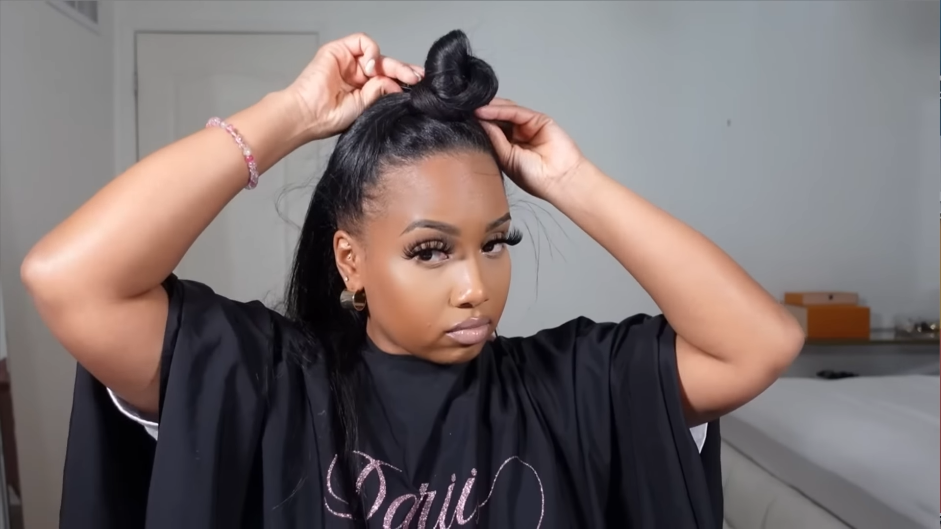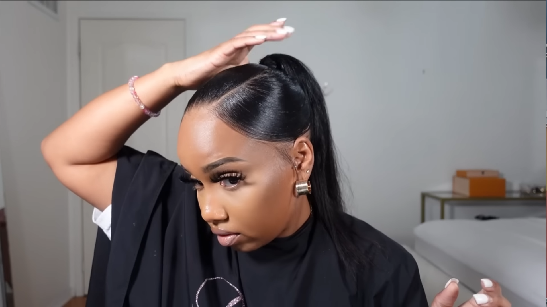 - Gather the slicked-back portion into a ponytail at your desired height and secure it with a hair tie.