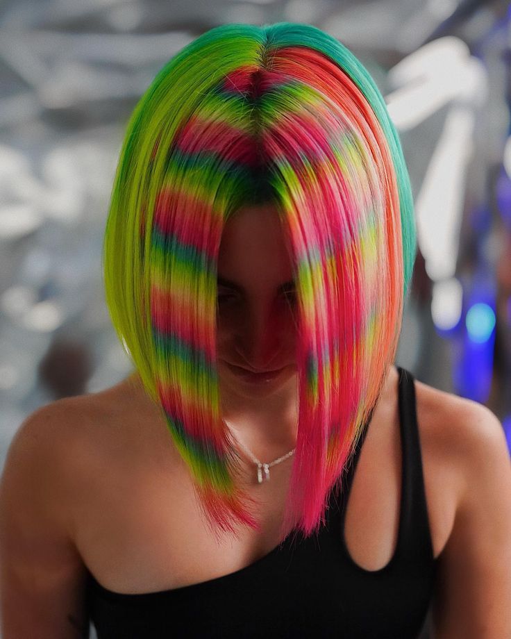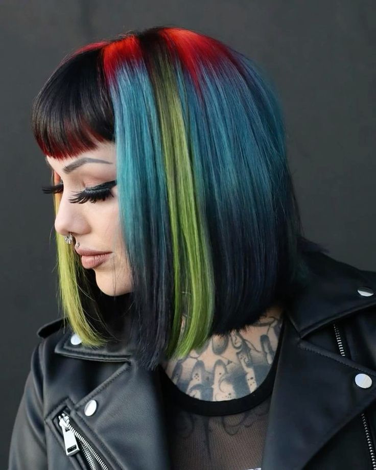 This bold, aesthetic bob features blocks of blue, green, and red hues against a dark base, resulting in a striking color-blocked effect. Each color is placed with precision, giving the bob a structured, artistic vibe. It’s a perfect style for those who appreciate high-contrast, geometric designs in their hairstyle. The color placements make this bob a true statement piece, suitable for artistic events or any setting where creative expression is celebrated.