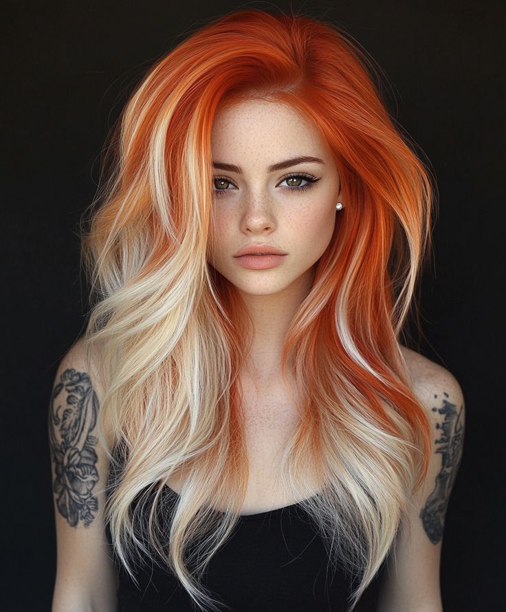 For a more subdued approach to split dyed hair, try black hair with orange highlights framing the face. This style suits those who prefer a low-key yet striking look, perfect for both formal and casual settings. It’s ideal for long, wavy hair, where the orange highlights add depth and dimension without overwhelming the dark base. This look has a dark yet sophisticated vibe, perfect for anyone who wants a chic, understated split dye.
