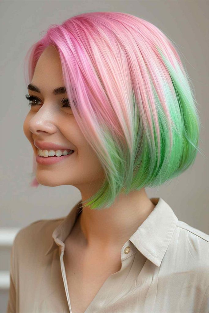 A black bob with an underneath green gradient, this hairstyle exudes sophistication with an unexpected twist. The black top keeps the style subtle, while the green underneath offers a refreshing pop of color that’s visible with movement. This look is ideal for those who want a cute, low-maintenance style that still makes a statement. It’s a great choice for anyone looking for a balance between classic elegance and playful color.