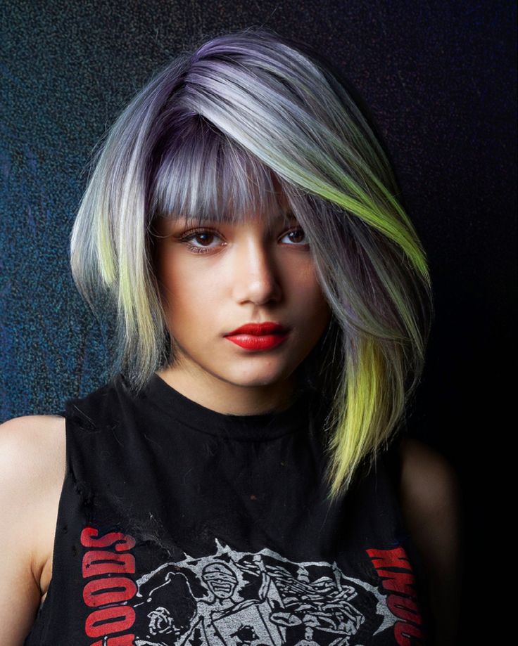 This purple and neon yellow style combines smokey lavender with pops of neon yellow, making for a unique contrast. The subtle base shade of lavender keeps the look soft, while the yellow accents bring a refreshing brightness. Ideal for someone with a playful style, this split dye is perfect for shorter cuts that showcase the bangs and contrasting colors. It’s a striking look that combines softness with a hint of edge, perfect for experimental color lovers.