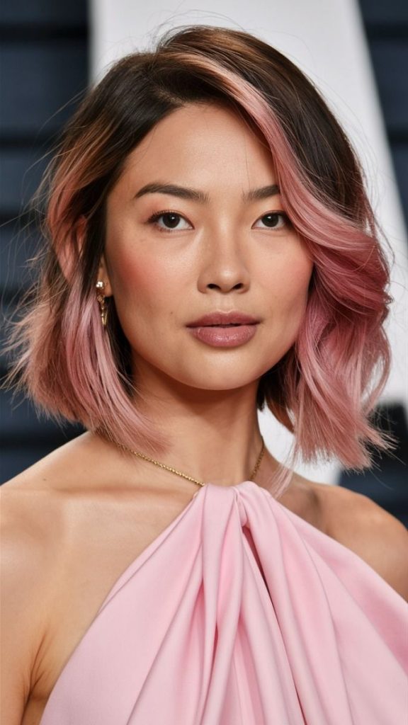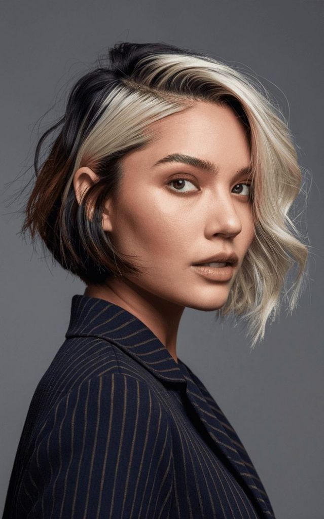 For those who love warm tones, this rose gold bob with dark roots offers an elegant twist on split dye. The blend of pink and gold hues creates a soft, flattering glow, while the dark roots add depth and dimension. This style is versatile and can be worn both casually and formally, making it ideal for someone who wants an understated, professional look with a bit of flair. The rose gold hue is also incredibly flattering for a variety of skin tones, making it a popular choice for 2025.