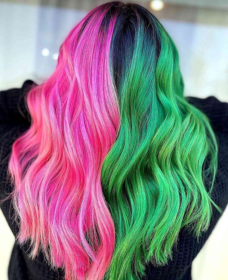 For an extreme take on split dye, this half pink and half green style is vibrant and unapologetic. The colors are divided cleanly, making for a striking two-tone look that’s perfect for someone with a bold personality. This style works especially well on wavy or curly hair, where the colors can create a mesmerizing effect. It’s ideal for anyone who loves attention-grabbing styles that make a powerful statement, a true testament to self-expression and creativity.