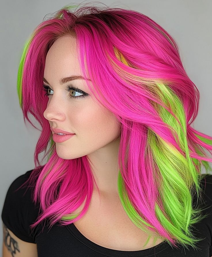 This pink and green split dye channels a vibrant, almost otherworldly aesthetic that’s playful and whimsical. The neon pink base with green streaks mixed in creates a high-energy look, perfect for someone unafraid to stand out. This style is especially suited for layered or curly hair, as the colors cascade through the waves. Inspired by bold fashion icons, this look is perfect for those with a love for vivid, Melanie Martinez-inspired styles.