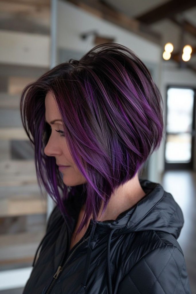 For a subtle yet impactful style, this purple and black blended bob creates a mysterious and modern look. The rich purple highlights run through a dark base, making the color contrast noticeable yet smooth. The angled bob cut enhances the color’s depth, creating a style that’s both chic and edgy. This look is perfect for professional settings while still allowing a touch of personality to shine through, ideal for anyone seeking a muted but fashionable split dye.