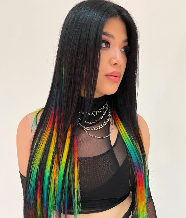 A classic black top with a rainbow underneath adds an element of surprise to this long, sleek hairstyle. The colors peek through with movement, creating a lively effect that’s only fully visible when the hair is styled or flipped. This look is perfect for anyone who wants to keep a natural color on top while embracing a vibrant, aesthetic style beneath. The rainbow tones add excitement, making this an ideal choice for festivals, parties, or simply to brighten up daily life.