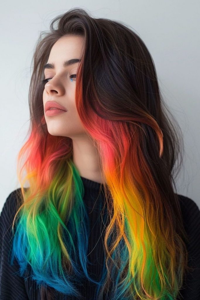 If you love a mix of colors but want a more understated look, consider dark hair with underneath rainbow-dyed tips. The rainbow gradient starts with warm tones like red and orange near the face, blending into cooler hues towards the back. This style is versatile, allowing the top layer of natural dark hair to flow over the colors for a more subtle effect or parting it to reveal the colors. Ideal for someone seeking a playful, aesthetic style without going fully colorful.