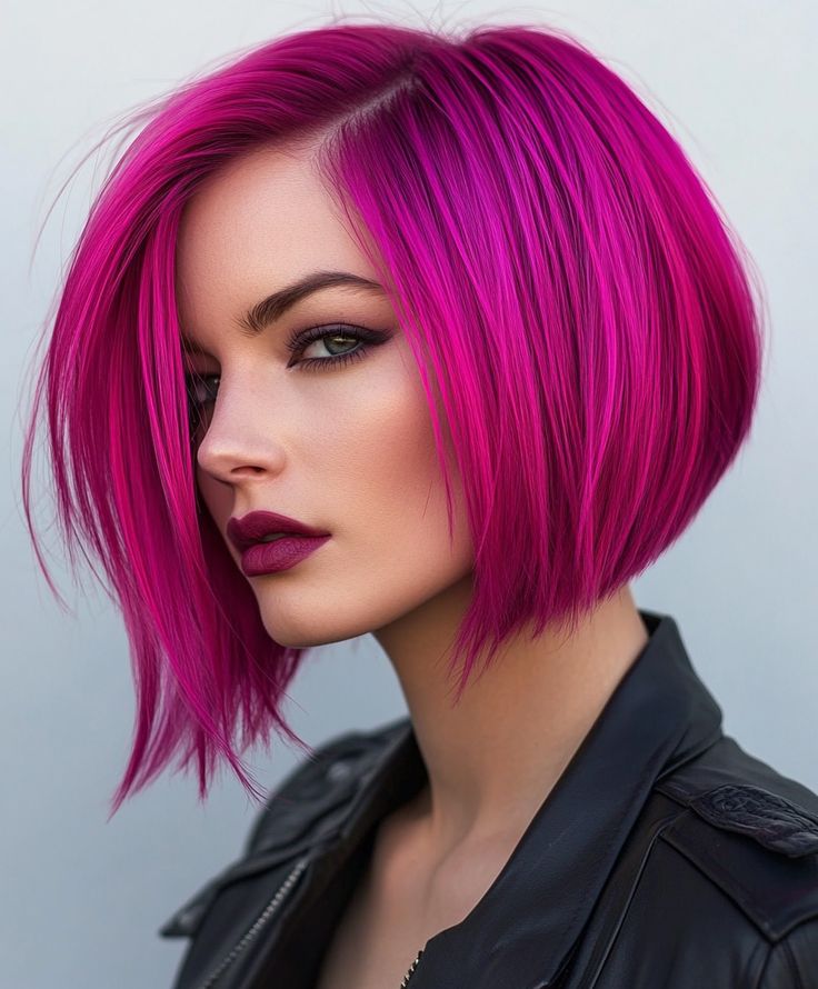 This intense fuchsia bob is a perfect choice for those looking to make a bold statement. The deep, vibrant shade of pink is eye-catching, radiating confidence and charisma. With its clean lines and slightly asymmetrical cut, this look is both sharp and feminine. This short style pairs well with bold makeup choices, enhancing the dramatic vibe. The color is ideal for those who love aesthetic styles that make a strong impression, perfect for formal events or casual outings with a bit of an edge.